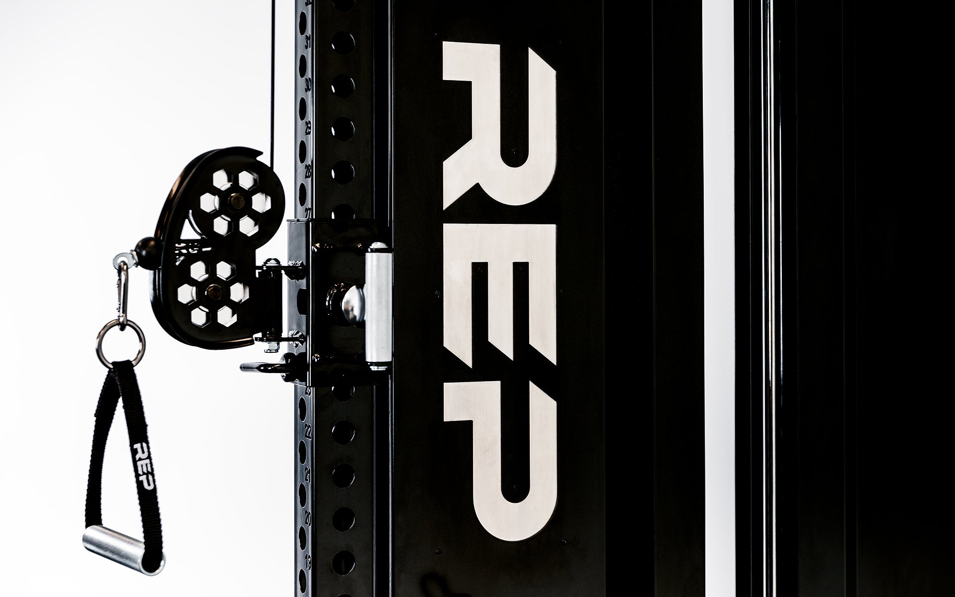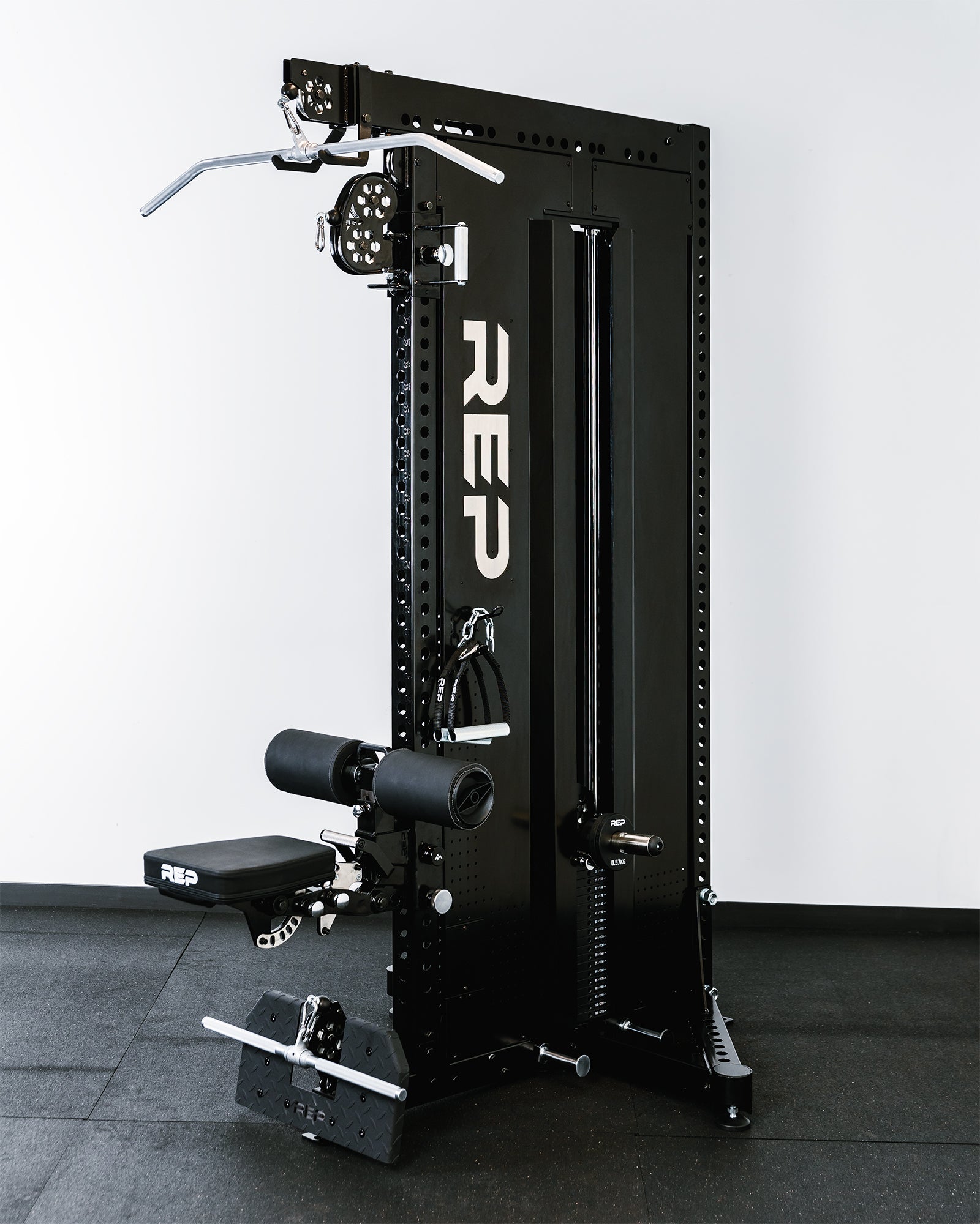 The cables are made from high-quality, galvanized wire with a raw steel core. The pulleys are made from smooth, durable, strong aluminum, and the front pulley has a 180-degree swivel for versatility. The heavy-duty 3x3” 11-gauge steel base and uprights (front and back) allow you to maximize functionality by facilitating attachment connections and offering space-save storage solutions. Laser-cut numbering on the front upright makes it easy to find the desired position. The Adonis™ cable tower comes with a telescoping footplate, with seven adjustments to brace against during low rows, and a pair of knurled steel D-handles, hard-chrome lat pulldown bar, and low row bar. It’s also compatible with a wide assortment of additional cable attachments. Full-length metallic black shrouds with a recessed, stainless-steel REP logo are included. The shrouds feature a laser-cut pegboard with pegs (pair of 4" pegs included) for storage of small attachments and add-on weights. The Adonis™ cable tower is finished with a premium metallic black powder coat which provides durability and an upgraded aesthetic. You can switch from a plate-loaded system to a selectorized system with the conversion kit. You can also add the Pegasus™ attachment, a premier seat and upright attachment, to assist with exercises like lat pulldowns, sit-ups, chest supported rows and more.