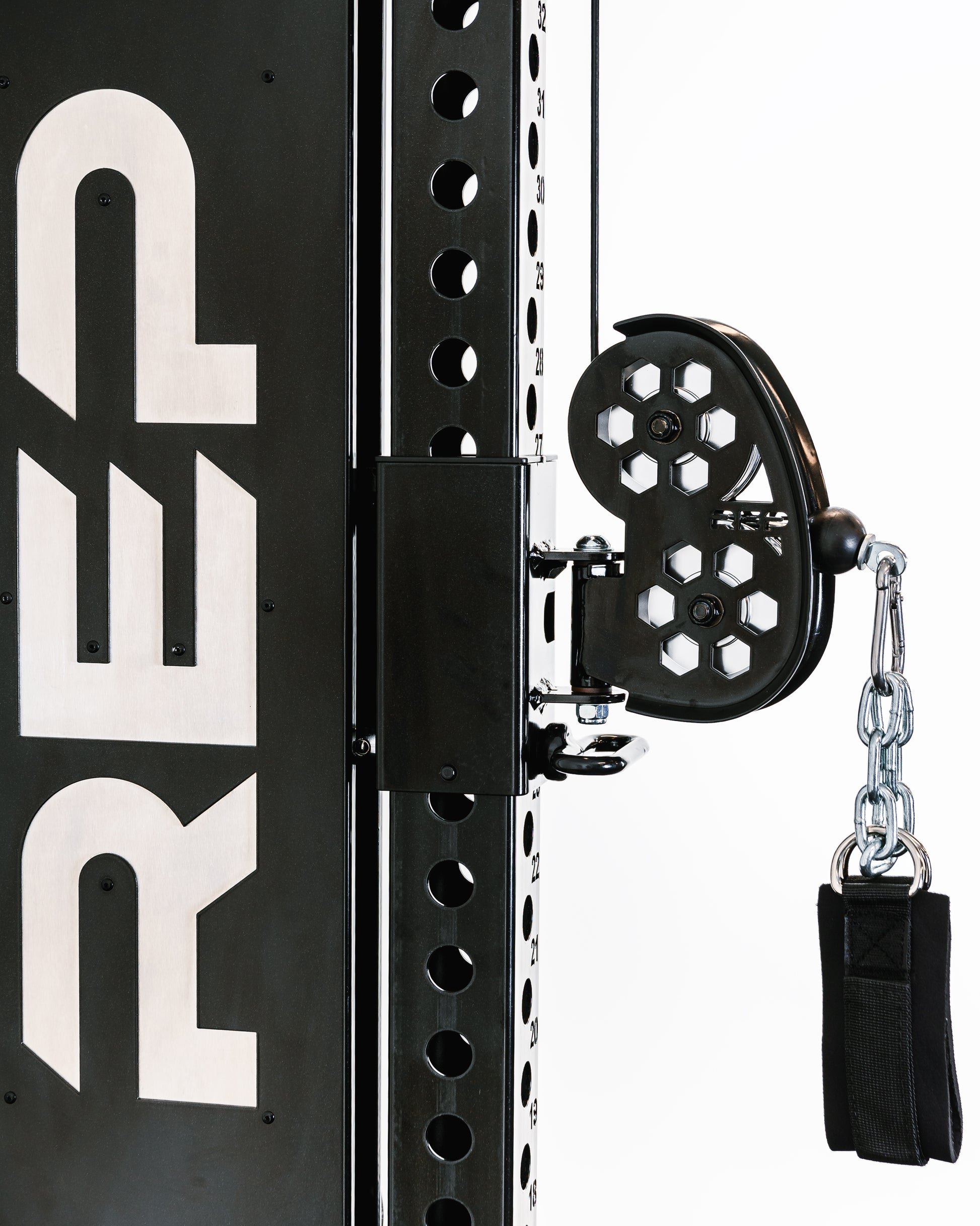 Transform your space with the Adonis™ cable tower – offering unparalleled versatility in one functional cable system. The Adonis™ cable towers, available in both plate-loaded and selectorized options, are sleek, low-profile cable machines. They can function as stand-alone units, seamlessly extend your 5000 or 4000 Series power rack or rig, or integrate effortlessly with REP's Modular Storage System . The Adonis™ cable tower is the first of its kind, featuring a 1:1 ratio (20lbs feels like 20lbs) for the lat pulldown and low row feature and a 2:1 ratio (20lbs feels like 10lbs) for the adjustable trolley. The plate-loaded Adonis™ cable tower features built-in stainless-steel weight horns with a max loadable capacity of 360lbs. The selectorized Adonis™ cable tower has a 210lbs weight stack of machine-finished, hot-rolled, steel plates for consistent, durable weight, plus stainless-steel weight horns to add even more weight. Easily adjust the weight stack with a magnetized pin. Add more resistance to either version with resistance bands on the integrated band pegs up to the max capacity of 450lbs. The Adonis™ cable tower comes with one pair of 1.25lb and a pair of 2.5lb plates accented by a Grecian pattern -- a nod to the mythology that inspired the equipment's name. Thirty-four different cable positions allow you to maximize your range of motion, and patent-pending , plastic lined trolleys are easy to adjust with one hand.